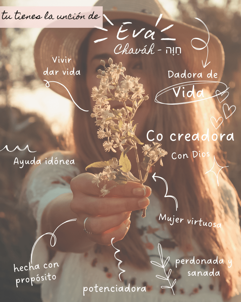 Descubrí que el nombre Eva, en hebreo חַוָּה (Javá), significa vida o la que da vida. Proviene del verbo חָיָה (jayah), que significa vivir o dar vida. Eva fue la primera mujer creada por Dios, y todas las mujeres llevamos su esencia. Fuimos creadas para dar vida y también para vivir una vida abundante.