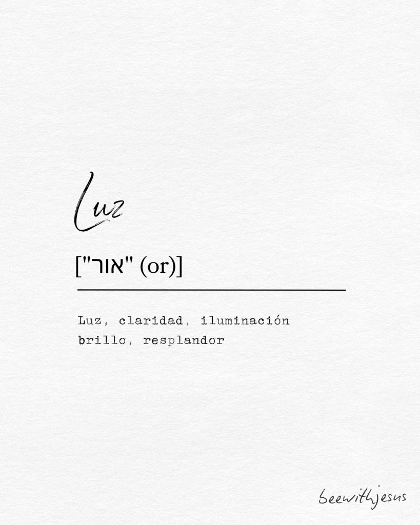 Luz: La palabra “luz” en hebreo es “אור” (or), que significa “brillo” o “resplandor”. En griego, la palabra es “φῶς” (phōs), que se refiere a la luz como emanación natural y como símbolo de conocimiento y pureza espiritual. La palabra “luz” o “alumbrar” da la idea de aclarar algo, de poner luz donde hay oscuridad. Esto es precisamente lo que Dios hizo al principio: “Y dijo Dios: Sea la luz“. Fue su primera orden, poner luz donde había oscuridad. Orden donde había caos. En lo espiritual ocurre lo mismo: el primer paso en cada vida transformada por Jesús es cuando Él dice “Sea la luz“, pues Él es la Palabra, el Verbo hecho carne.