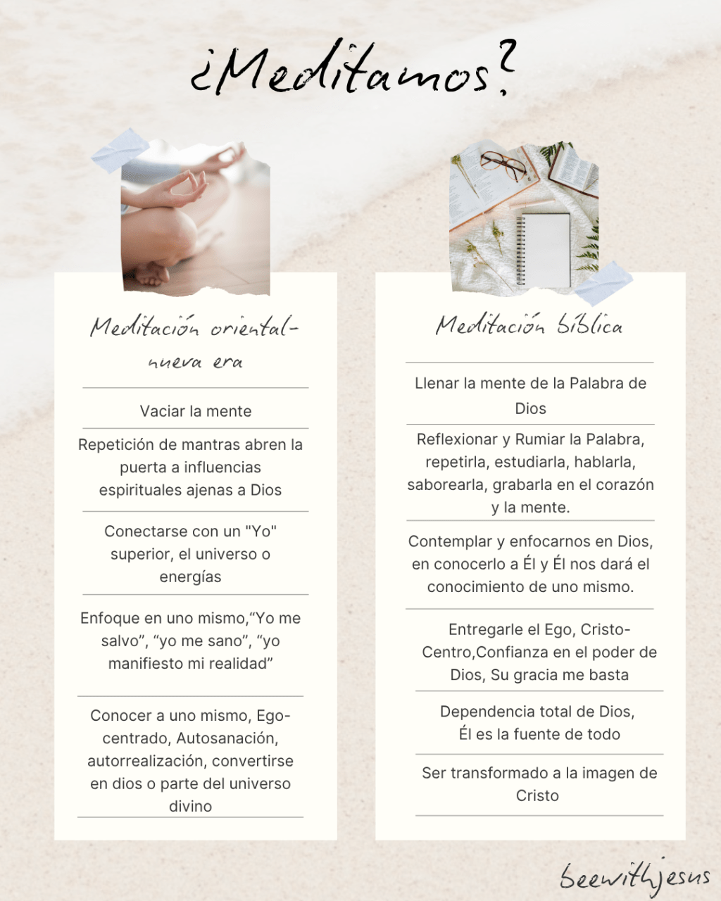 Este término no guarda relación alguna con la interpretación de “meditar” en las religiones orientales ni con su uso en la actualidad en contextos de la nueva era, como el yoga, entre otros. Estas interpretaciones erróneamente sugieren el acto de vaciar completamente la mente para conectarse con un “Yo” superior, el universo o energías. Debemos ser cautelosos al respecto, ya que una mente vacía brinda un espacio perfecto para que los demonios entren y encuentren morada.