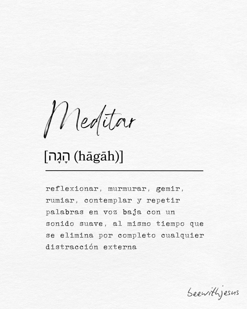 La palabra “Meditar” en hebreo se traduce como “Hagah“, y engloba el significado de reflexionar, murmurar, gemir, contemplar y repetir palabras en voz baja con un sonido suave, al mismo tiempo que se elimina por completo cualquier distracción externa¹⁵.