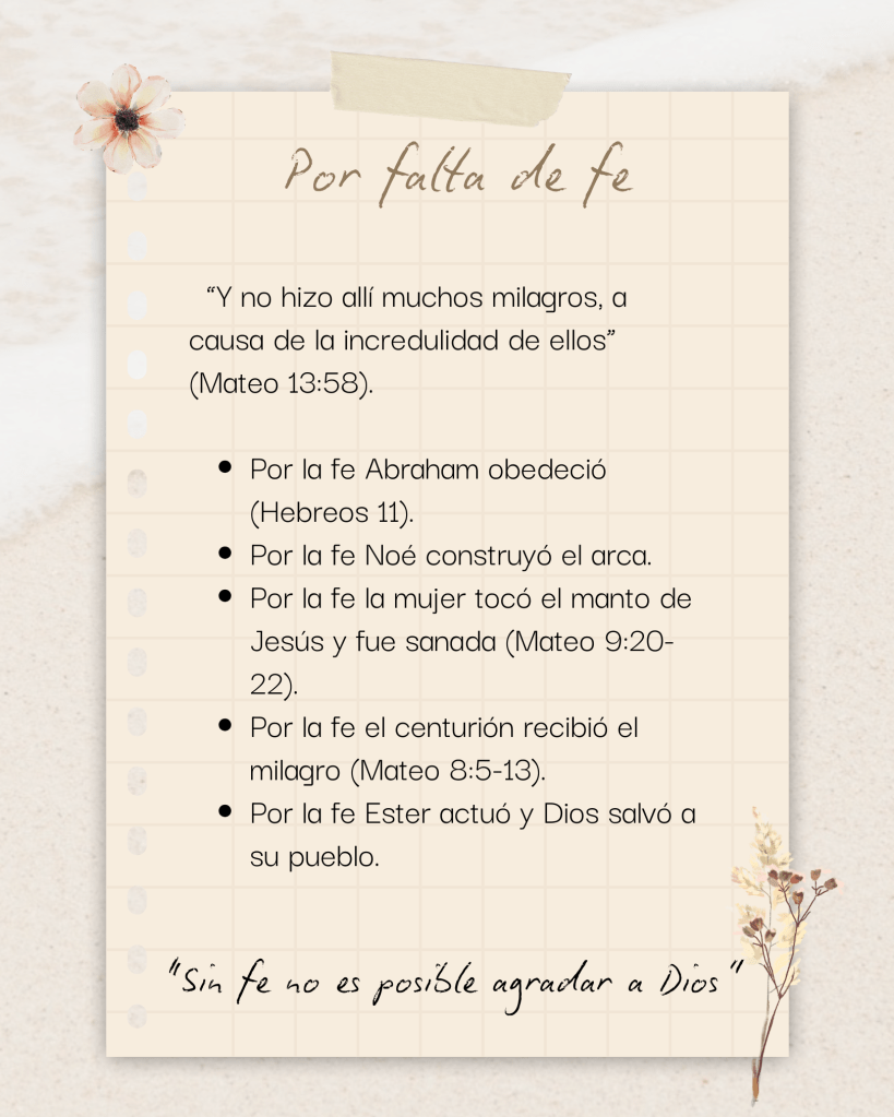 Y hay un versículo que siempre me viene a la mente: “Y no hizo allí muchos milagros, a causa de la incredulidad de ellos” (Mateo 13:58). Para que Dios actúe, necesita encontrar fe en nosotros.